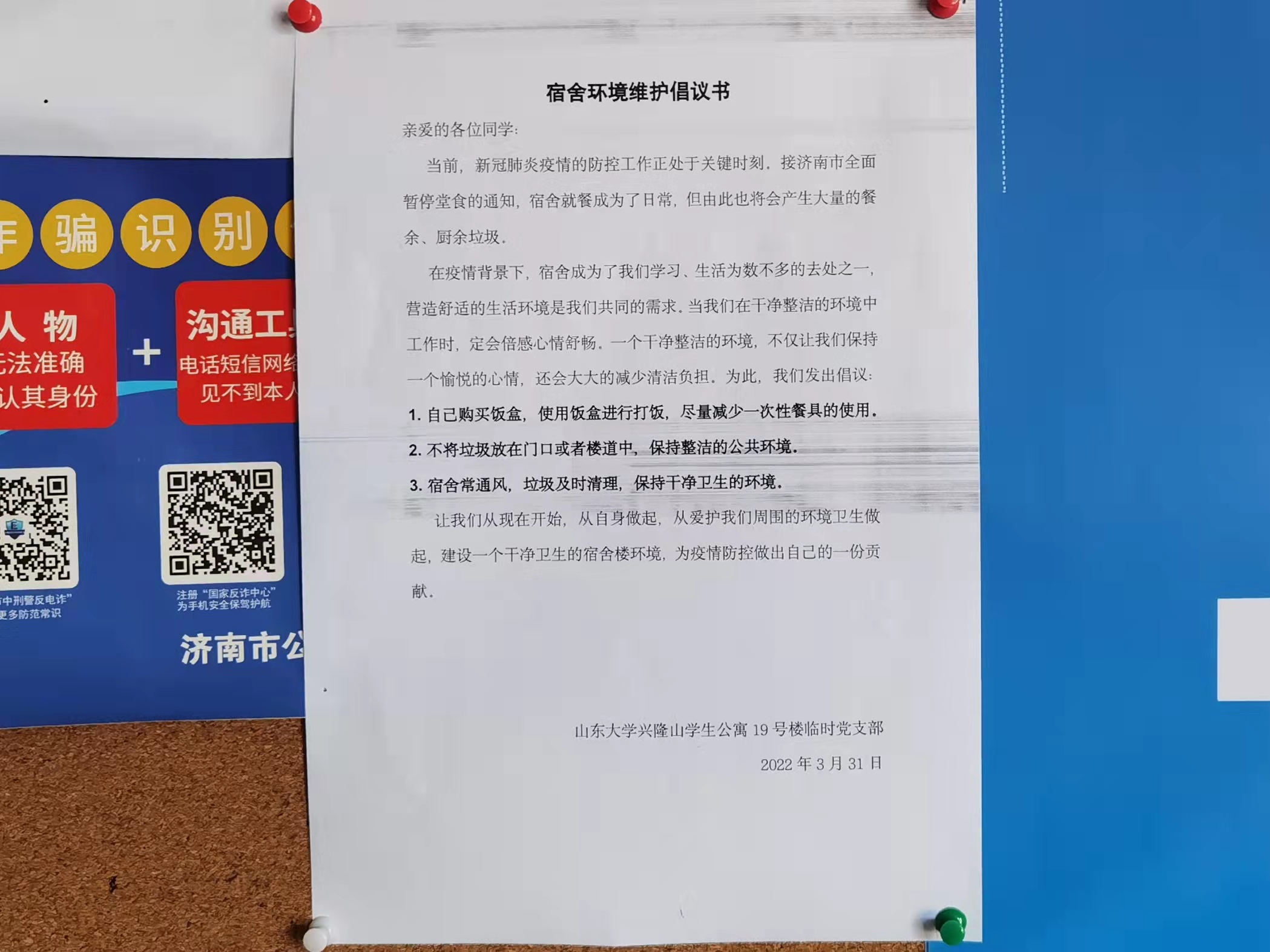 为更好地发挥临时党支部的作用,19号楼楼长kaiyun开云官方网页版辅导员刘慧慧老师、临时党支部书记能动学院学生张友浩同志迅速反映,第一时间与宿管徐日慧老师沟通联系,了解诉求。得知部分宿管、保洁老师不能到岗的情况,为协助宿舍阿姨做好19号楼相关工作,支部于3月31日下午向19号楼内同学们分发《宿舍环境维护倡议书》,线上线下相结合做到楼内同学全覆盖,呼吁同学们从自身做起,建设宜居的公寓环境,为疫情封控贡献自己的力量。
