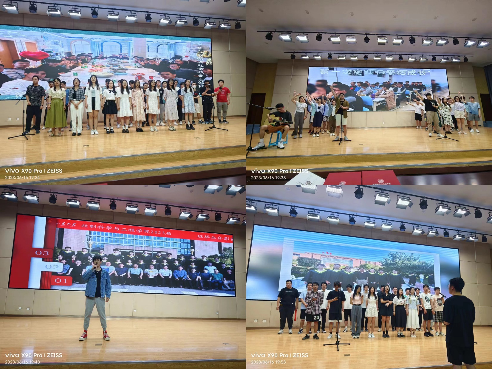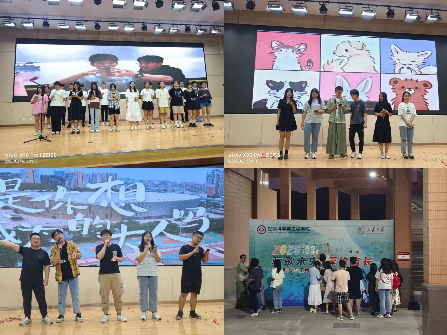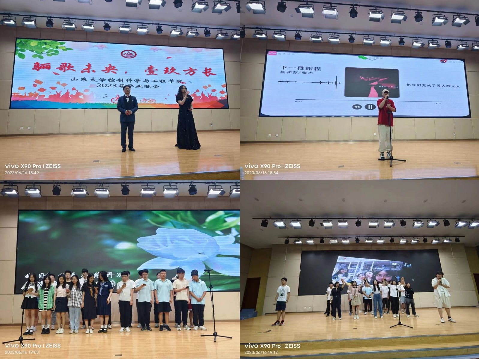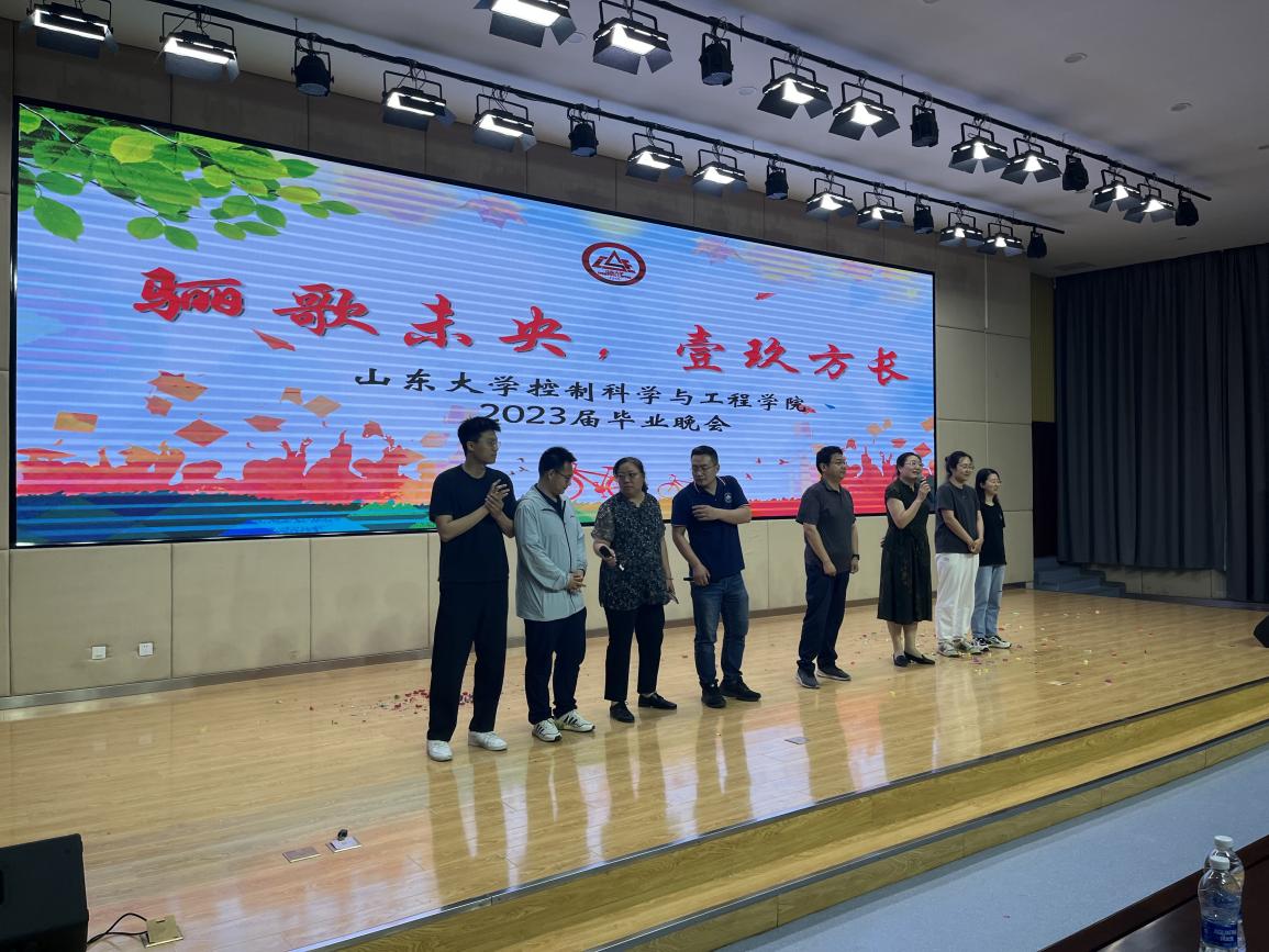 伴随着学院领导、班主任和专业课教师的寄语视频,晚会拉开帷幕。首先,山东大学十大歌手、2019级本科毕业生刘闯的一首《下一段旅程》瞬间点燃了现场的气氛,大家共同欣赏2019级各班毕业生们精心准备的纪念视频和毕业节目,自动化1班带来一曲《栀子花开》,让大家重温初入山大的美好时光,记忆犹新;自动化2班共同合唱《你曾是少年》,轻松的气氛缓解了离别的伤感;自动化卓越班带来一首《蓝莲花》燃爆全场,赢得了大家的阵阵掌声;自动化4班演唱的《再见》和人工智能与机器人班带来的《凤凰花开的路口》将晚会推入高潮,现场欢呼声不断,掌声此起彼伏;自科班演唱的歌曲《十年》带领回忆了大学四年一幕幕熟悉的情境,让人既欢乐又感动;生医班合唱歌曲《同桌的你》,不仅唱出了兴隆山校区那些熟悉的风景,也唱出了所有毕业学子的心声;自动化3班一曲《送别》感染了在场学子倾情共唱,感动全场;宣传中心带来的歌曲《这世界那么多人》优雅动听,舒缓的歌声里,尽是大家对山大和控院的深深情意。最后,第39届学生工作委员会主席团在舞台上一起演唱了《亲爱的旅人》《朋友》等歌曲则唤起了同学们关于大学四年生活中点点滴滴的回忆,令人不禁流下了不舍的泪水。
