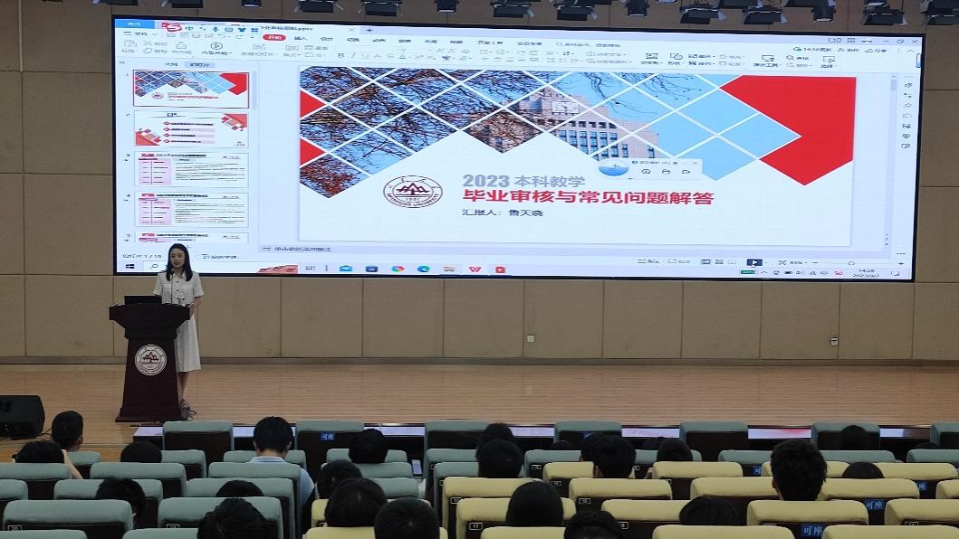 接下来,教务处鲁天晓、林磊同进行毕业审核与常见问题解答。鲁天晓介绍山东大学本科生学生学籍管理规定、选课常见问题及本科毕业审核要求,对毕业审核常遇问题进行汇总说明。她强调,同学们要根据毕业要求,做好学分绩点的核对工作,有任何问题及时与教务处沟通。随后同学们进行现场提问,林磊同、鲁天晓就选课、学分转换等问题作出解答。