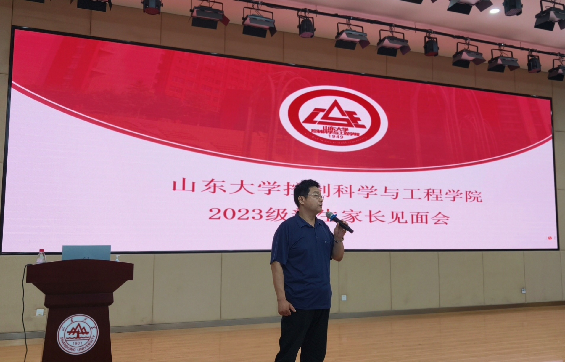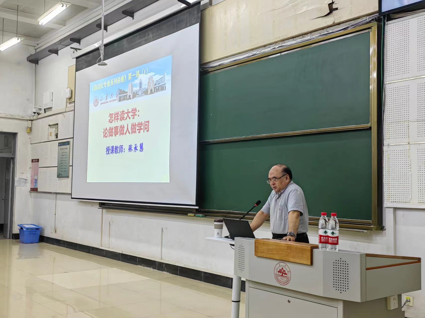 院长张承慧以“怎样读大学:论做人做事做学问”为题目给2023届新生讲授开学第一课,做好学生成长路上引路人。他表示,多年来自己一直致力于自动化类专业教育教学、新能源发电技术创新工作,在教育、科研、队伍、平台等方面做了很多尝试和努力,也取得了一些成绩,希望通过分享自己的经历能够让同学们有所收获。他语重心长地说,每个夜晚头顶明月走在静谧的校园中,看着一间间灯火通明的实验室在夜色中熠熠生辉,心中都颇多感慨,“幸福生活在哪里?要靠奋斗来创造。”如今的山东大学正处于实现“由大到强”历史性转变,开创内涵式高质量发展的关键时期,每一位山大人都在努力拼搏,奉献着个人力量。“敬业、精益、专注、创新”是我对科研团队的要求,更是我们高等教育工作者几十年如一日坚守的职业精神。我们何其幸哉,站在新的历史起点,感受着世界正经历百年未有之大变局,见证着我们的国家日益强大,这更需要我们勇做新时代的奋斗者,付出辛苦劳动和艰苦努力,这就是新时代黄大年精神的价值意蕴。