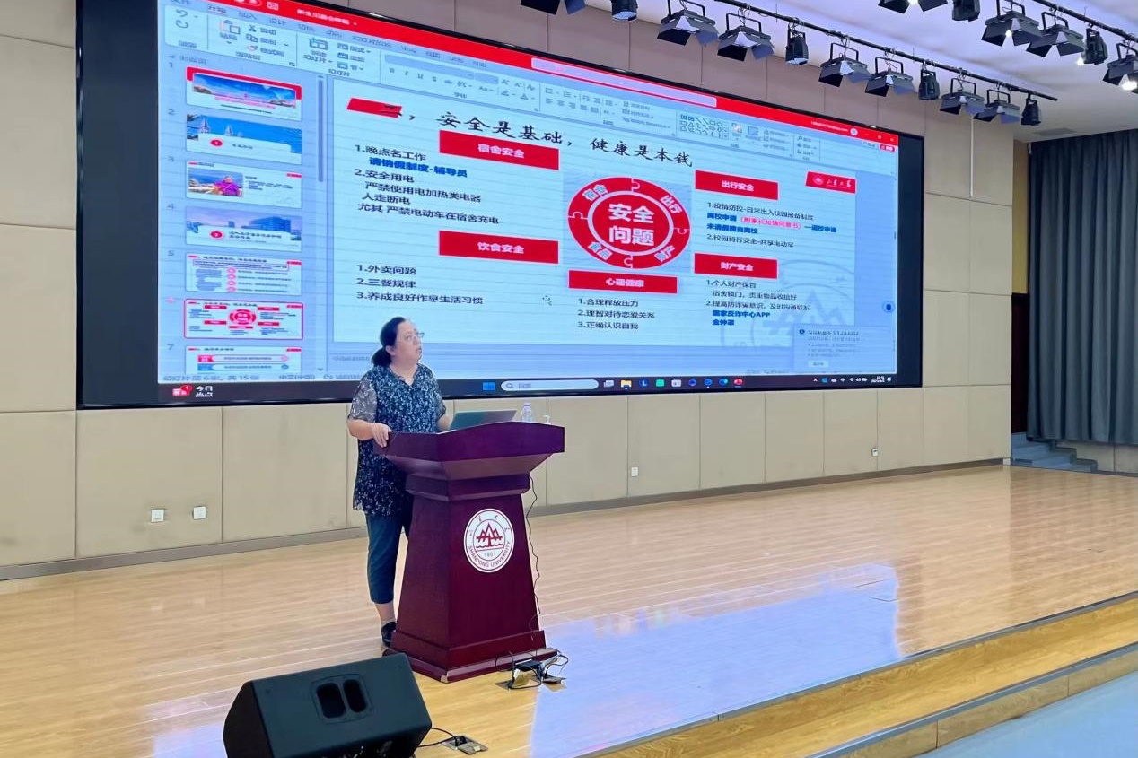 刘慧慧以进入大学需要适应和调整的内容为切入点,指出,做好大学学习与发展规划,寻找适合自己的学涯和职涯目标,提高执行能力,学会自我管理,珍惜光阴、勤奋进取;同时,大学是走向社会的桥梁,首先在大学同学们要培养规矩意识,建立底线思维,严格遵守法律法规、校规校纪;此外,刘慧慧鼓励同学们尽快积极融入集体,在集体中互相尊重彼此,提升个人集体荣誉意识和责任感,营造和谐共处的集体氛围;并针对宿舍、出行、饮食、财产、心理五点重点强调安全问题,再三叮嘱同学们养成良好的生活作息习惯,提高防诈骗意识,守住安全第一底线。