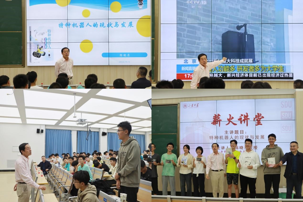 在后续的提问环节中,在座同学积极踊跃提出自己的疑问与困惑,陈晓东一一解答。活动现场气氛活跃,陈晓东为积极参与互动的学生赠送其编写的《特种机器人之奥秘》《机器人上战场》等书籍。师生们会后纷纷表示,此次讲座让他们受益匪浅,期待着未来陈教授能再次莅临山东大学,再次为师生讲解机器人的各类知识。