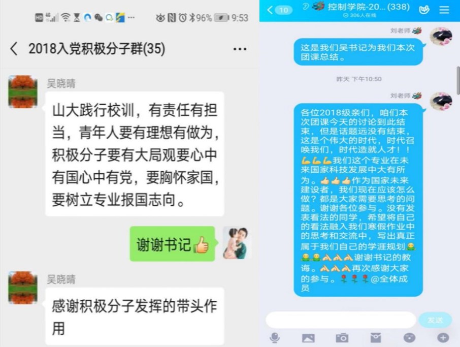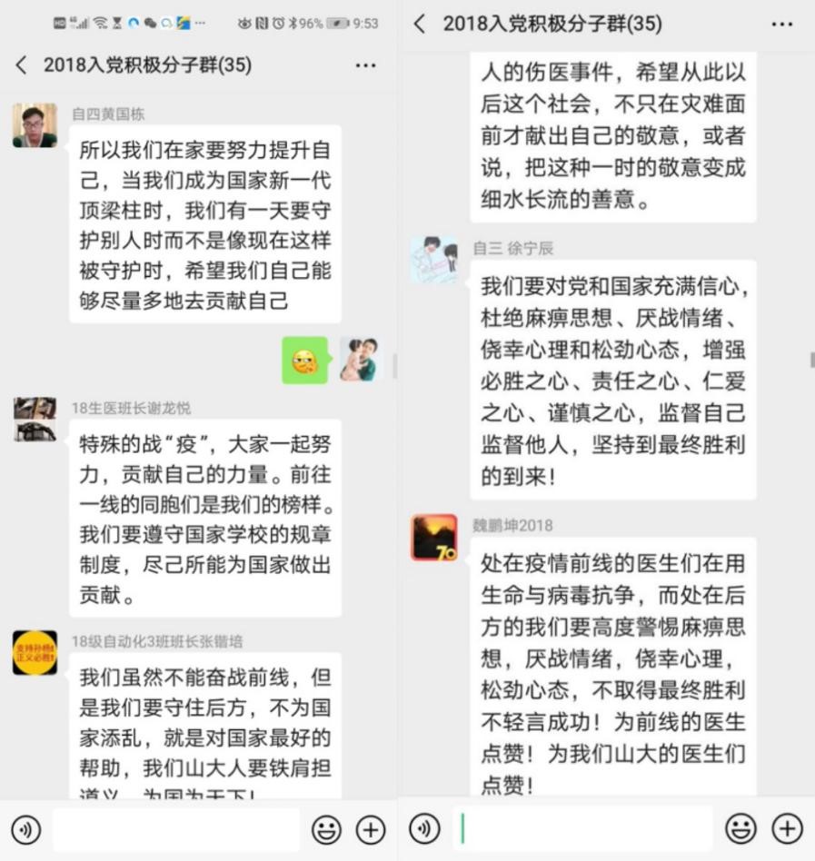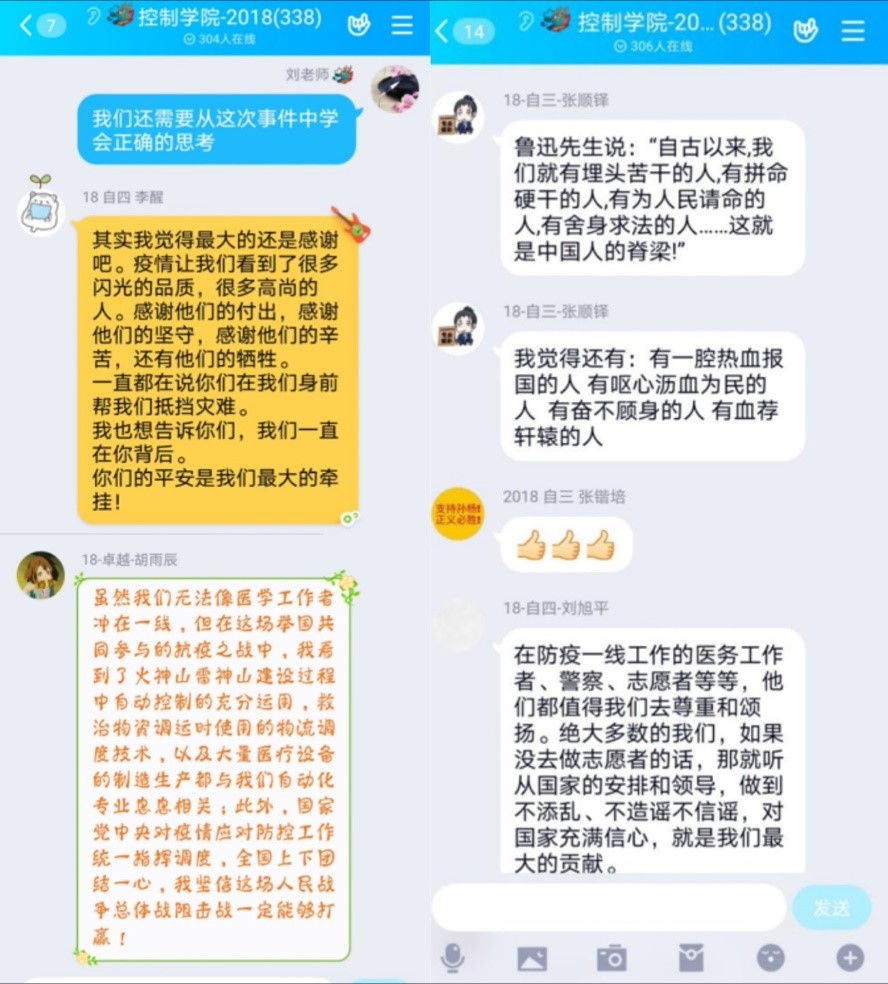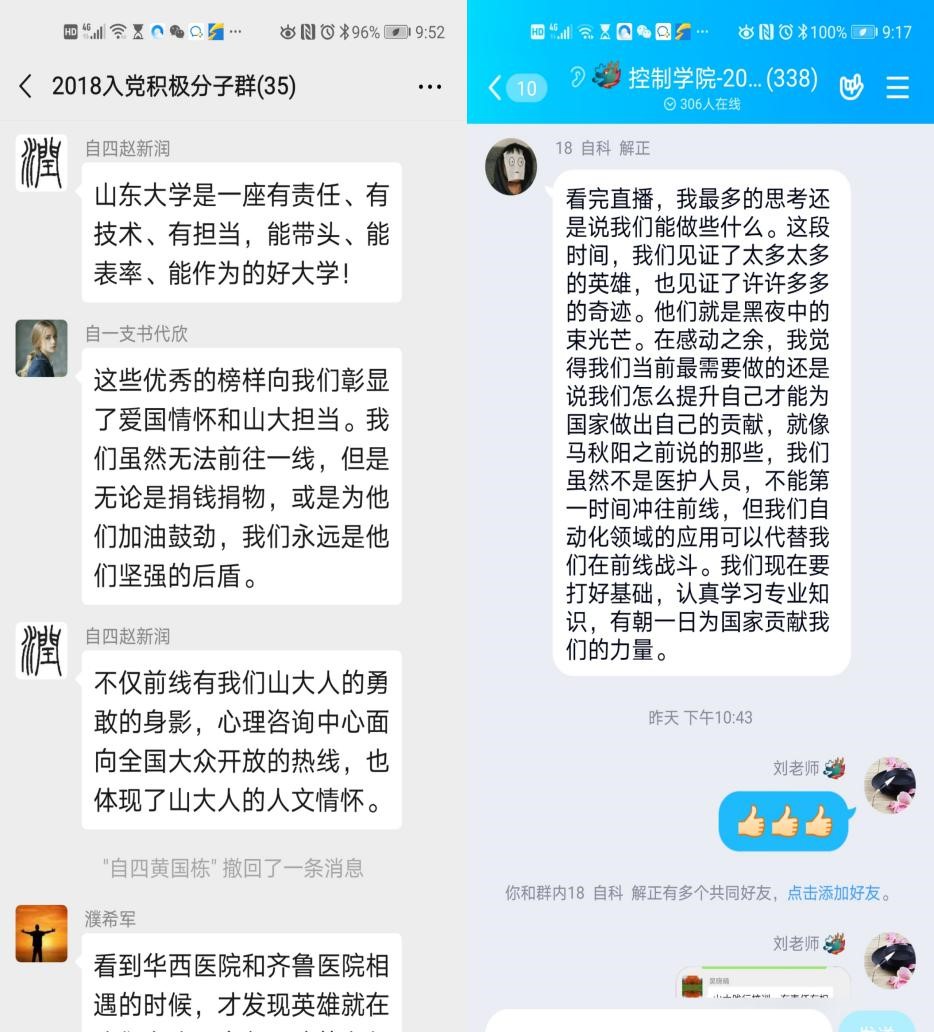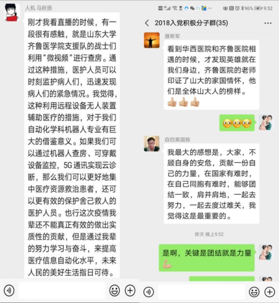 听到同学们的思考与发言,2018级辅导员刘慧慧老师感触颇深,她指出:“白衣天使的行为让我们肃然起敬!作为大学生,我们应该用小我融入大我,做好自己该做的事情,同时我们需要从这次事件中学会正确思考。网络信息真伪并存,希望大家能够明辨是非。在疫情中,党和国家以人民为中心的做法让我们清楚地看到国家制度的优越性,我们也从疫情中科学技术的应用明确了自己专业在未来发展的定位。时代召唤我们,作为未来的建设者,我们应该珍惜大学时光,好好学习专业课,建立明确的学涯和职涯规划,为未来自动控制发展做出应有的贡献。之后,党委副书记吴晓晴老师为我们的讨论作出总结发言:“山大践行校训,有责任有担当,青年人要有理想有作为,积极分子要有大局观,要心中有国、心中有党,要胸怀天下,树立专业报国志向。”