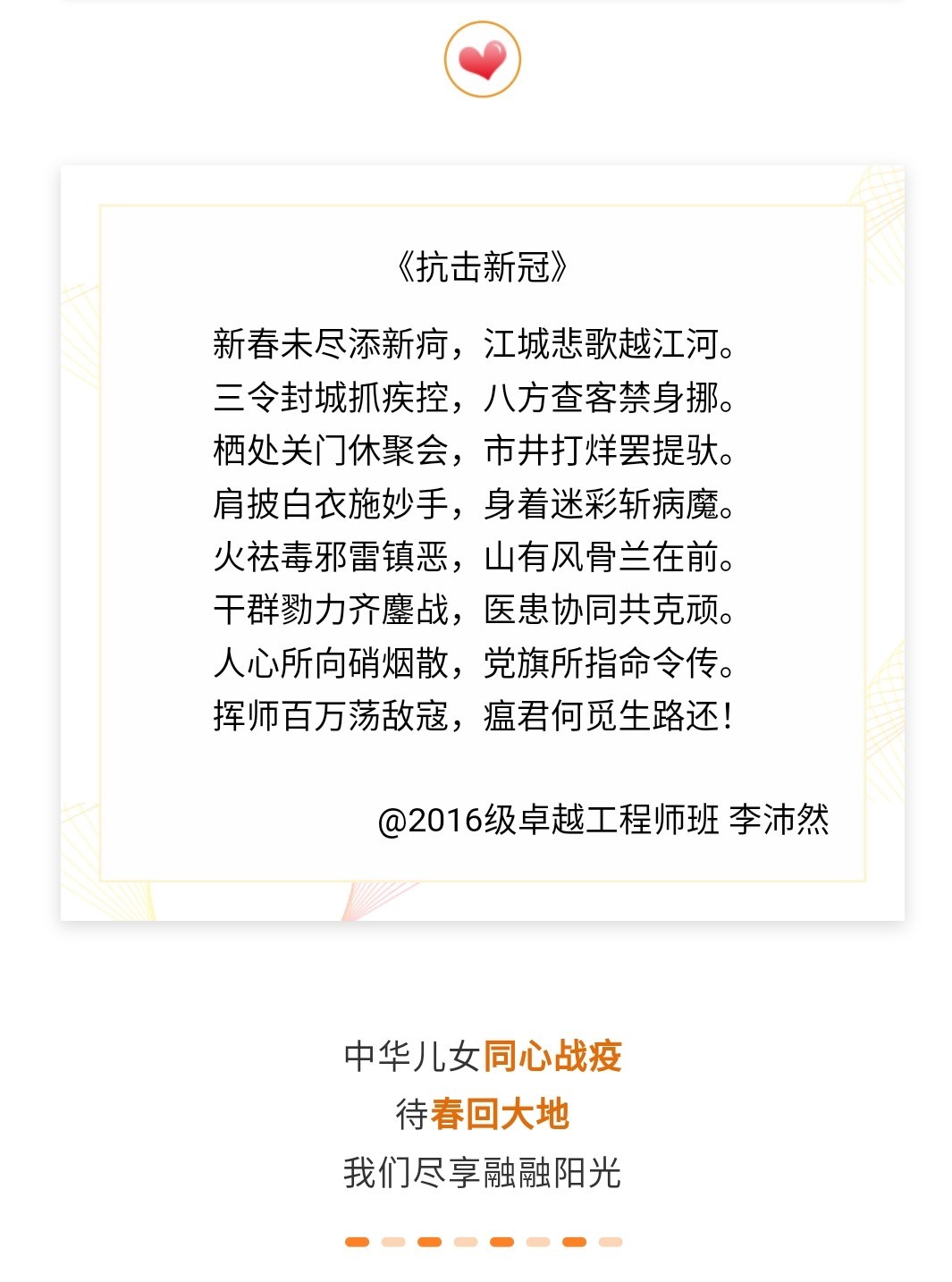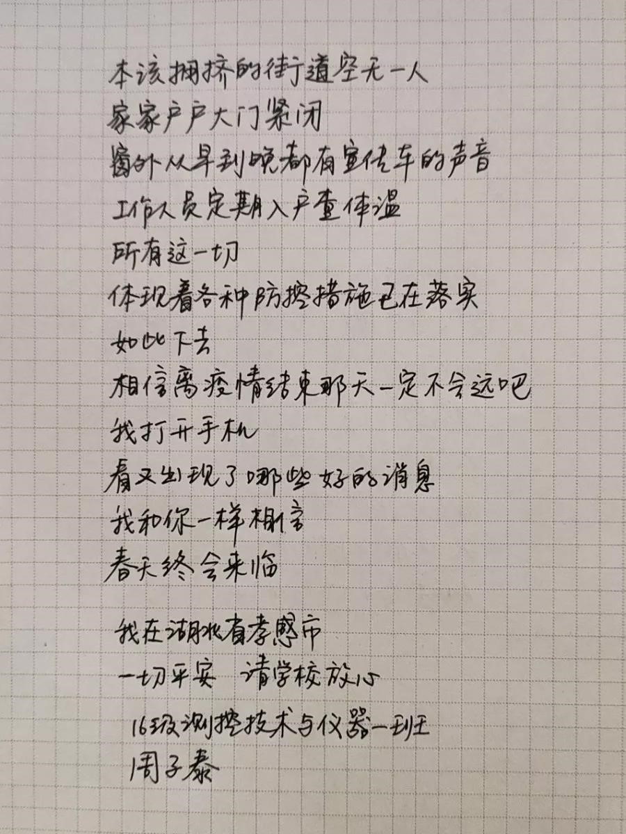 控制学院各社团还开展了手写加油接力活动,社团成员将对武汉的鼓励,对祖国的祝福付诸笔端,写下自己对身处疫情重灾区的同胞和奋战在抗疫一线的医护人员的殷殷情谊。同时,连心支教调研团、新青年学会、动漫爱好者联盟协会、智能车社团、绿领一族协会等多个社团在社团自媒体平台上发布抗疫推文,展现活动成果,号召更多人关注疫情、助力武汉,控制学院社团联合会发布的推文“待到山花烂漫时,我们再相见”也获得良好反响。