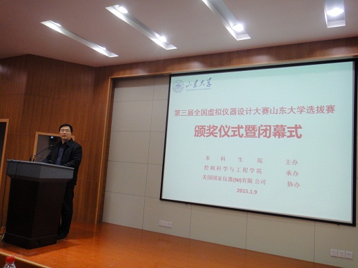 1月9日下午,第三届全国虚拟仪器设计大赛山东大学选拔赛闭幕式暨颁奖仪式在千佛山校区控制学院报告厅隆重举行。本科生院王丰晓副院长出席闭幕式为获奖学生代表颁奖并讲话。控制学院党委书记王志明教授、副院长高瑞教授、党委张振山副书记、过程控制研究所所长隋青美教授、美国国家仪器公司山东区域经理张立军工程师出席闭幕式并为获奖学生颁奖。