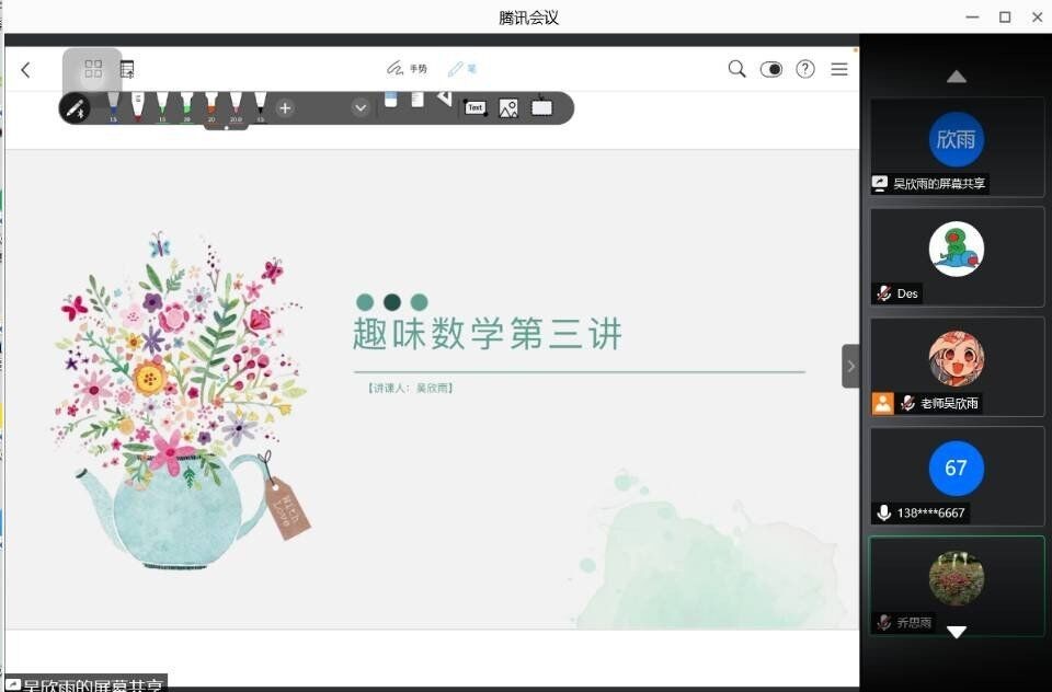 “七彩课堂”第二期是连心支教团第一次进行寒假支教,来自控制学院、历史学院等不同学院的八位同学担任本次支教活动的老师,通过网络平台腾讯会议给远在甘肃白银的学生们“云授课”。报名参加此次“七彩课堂”的学生年级从幼儿园到初中分布不等,跨度较大,“七彩课堂”紧紧围绕学生特点,兼顾兴趣与知识导向,重视学生的参与和体验感,内容从课内到课外,探求对学生综合素质的提升。趣味文化课设置英语口语提升、趣味数学、英语朗读三门课,兴趣课则包含美术、历史、手工制作等多方面内容,课堂中,师生互动频繁、课堂氛围轻松愉快,老师寓教于乐、寓学于趣。