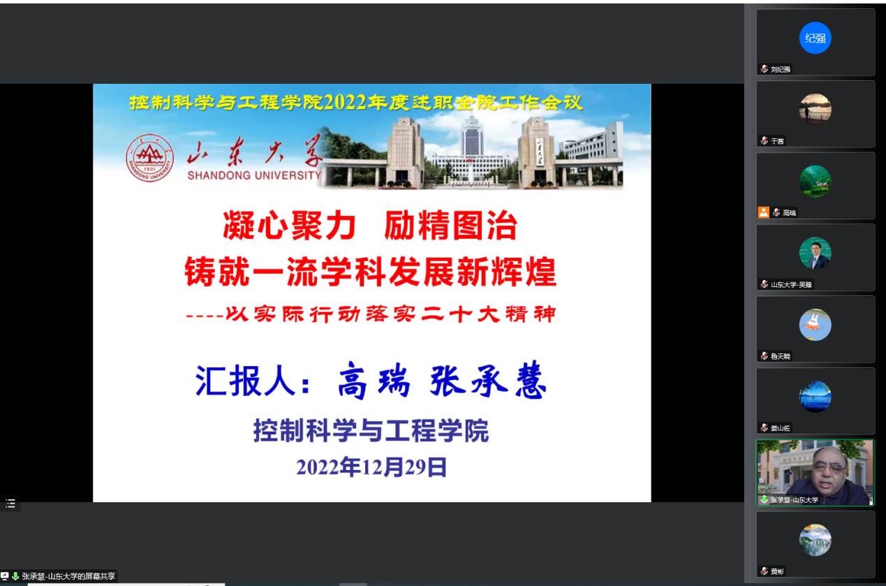 张承慧院长代表学院管服团队以“凝心聚力,励精图治,铸就一流学科发展新辉煌”为题做了控制学院2022年述职报告,围绕2022年度工作进展、建设任务与完成进度、奋斗目标与未来愿景等三个部分对学院事业发展进行了系统总结,谋划了下一步工作布局。张承慧表示,学院2022-2025任务目标按阶段/超前完成,学院各项事业再上新台阶。党建引领积蓄新动能,获评“山东省五四红旗团委”、山东大学“优秀基层教学组织”。杰出人才引育彰显新高度,新增国家杰青1人(高峰)、国家四青人才7人,其中国家优青2人、海外优青4人(均占全校的1/6)、青年拔尖1人,再创学院国家级人才增量历史新高;新增IEEE Fellow、ESI全球“高被引科学家”各1人、泰山学者青年专家6人。国家级人才增量/总量位居全校第一、全国同类学院学科前列。国际合作实现新跨越,获批2023年高校创新引智基地,为全校唯一。立德树人取得新成果,打造国家级一流专业全覆盖新格局,获山东省教学成果一等奖3项,获推申报国家级教学成果奖2项,山大教学终身成就奖1项。学科建设跃上新台阶,控制科学与工程学科晋级A类,综合实力名列全国同学科前茅。科学研究再创佳绩,获中国工程院光华工程科技奖和教育部技术发明一等奖各1项;山东省科学技术奖二等奖3项;中国自动化学会自然科学奖一等奖1项、二等奖3项。立项科研经费达1.5亿元/到位经费1.06亿元,暂居各学院之首。他强调,下一步学院将持续深入学习宣传贯彻党的二十大精神,加强组织建设,践行立德树人,强化学科建设,优化科研布局,深化国际合作,持之以恒用好“3D”工作法,为学校“双一流”建设贡献更大的控院力量和控院经验。